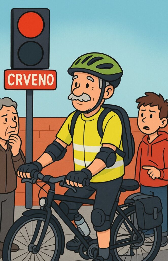 Djed Branko redovito prolazi kroz crveno. Da, da — baš ono crveno na semaforu. Kao da ga ne vidi. Ili ga “ne doživljava”. Pa se često pitamo: Što je to djed Branko zaboravio kod kuće? Nije kaciga. Nije ni zvonce. Nisu ni naočale…